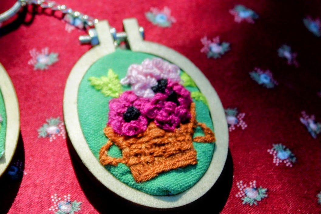 This miniature embroidery features a basket overflowing with vibrant poppies, stitched in pinks and reds with leafy green accents. A cheerful and unique accessory perfect for nature lovers and flower enthusiasts.